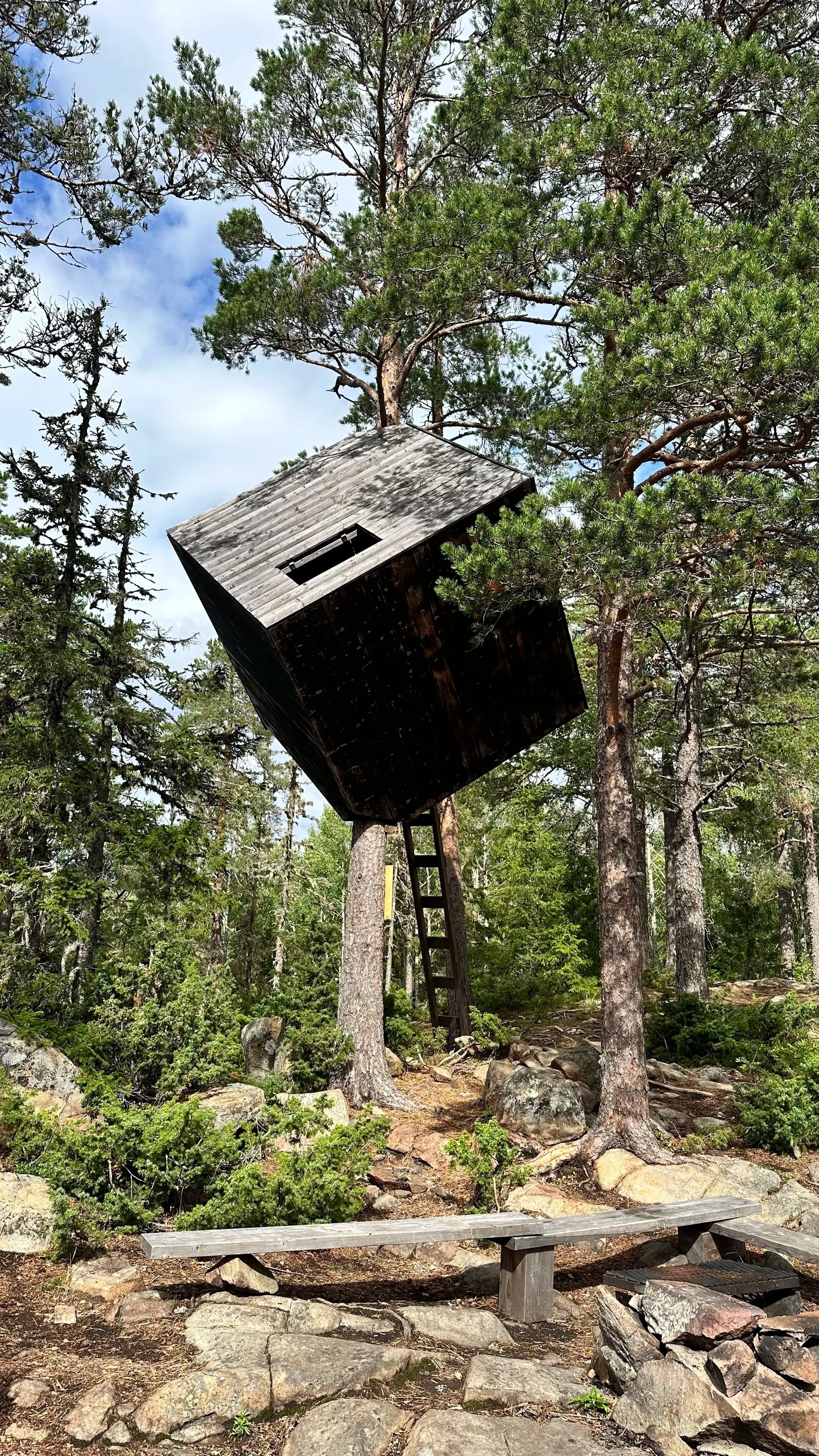 On explore en randonnée tout d’abord la ville Nordingrå avec ses prairies fleuries, îlots , et vestiges… on tombe même sur une cabane cubique insolite « the tree cube arknat » avec une belle vue sur la région… parfait pour une pause apéro bancale !
